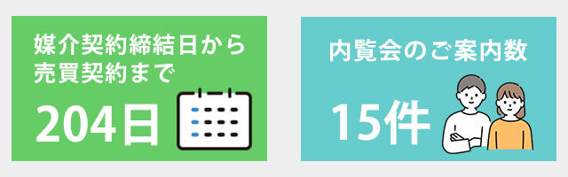 相場より高めに販売をスタートしたため、売却スタートから契約までに204日と時間を要しましたが、高値成約を目指し販売活動を行ってまいりました。