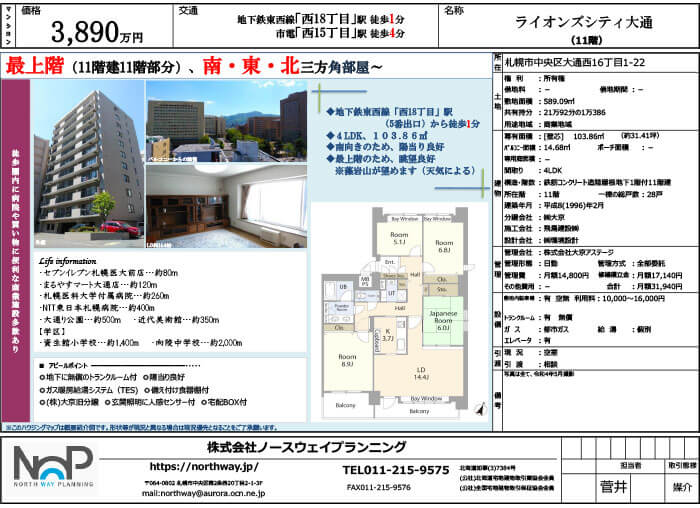 | 特徴 | 最上階、三方角部屋(南・東・北)、南向きのため陽当り良好、眺望良好、札幌医科大学等の病院が点在 |