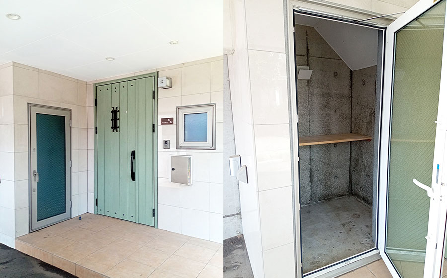 左:駐車スペース奥にある緑色の特徴的な玄関ドア。/右:玄関横には収納スペースを完備。スキー用品やキャンプ用品、車のタイヤ等を収納できます。