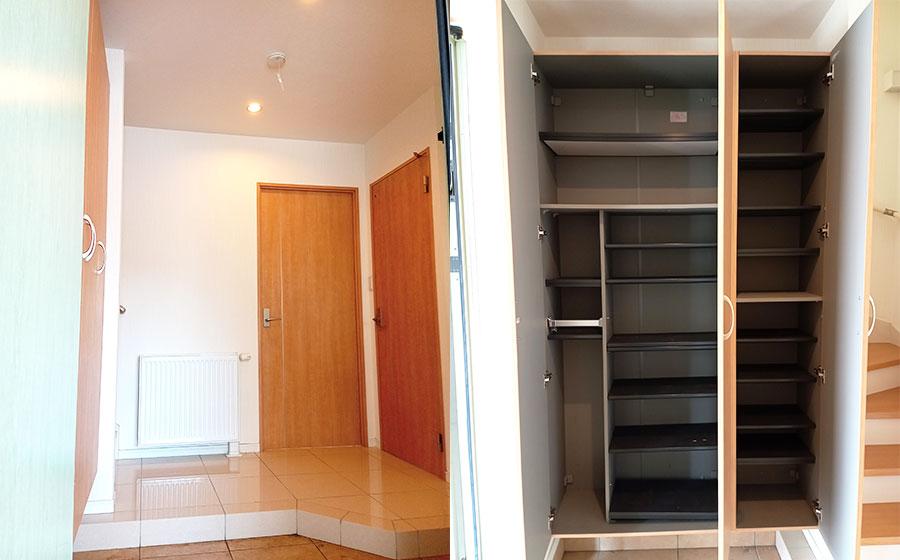左:広々とした玄関が迎えてくれます。/右:玄関横には豊富な収納力があるシューズボックスを完備。