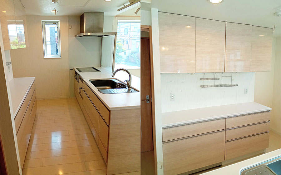 左:換気にも利用できる窓付の明るいキッチンエリア。食洗器付きで3口コンロのIHタイプです。※リフォームによってガスコンロへの変更も可能です。/右:たっぷり収納ができそうな備え付けの収納棚。