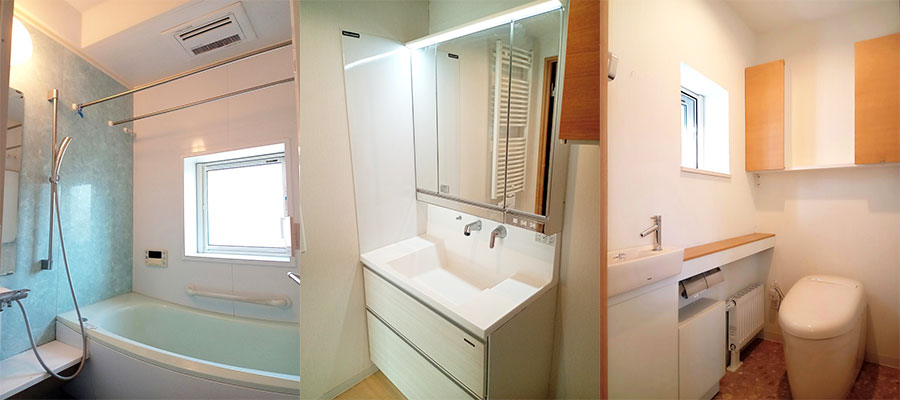左:1616サイズの浴室。嬉しい換気用の窓が付いています。真ん中:シンプルなデザインの洗面台。右:2階にもトイレが用意されています。