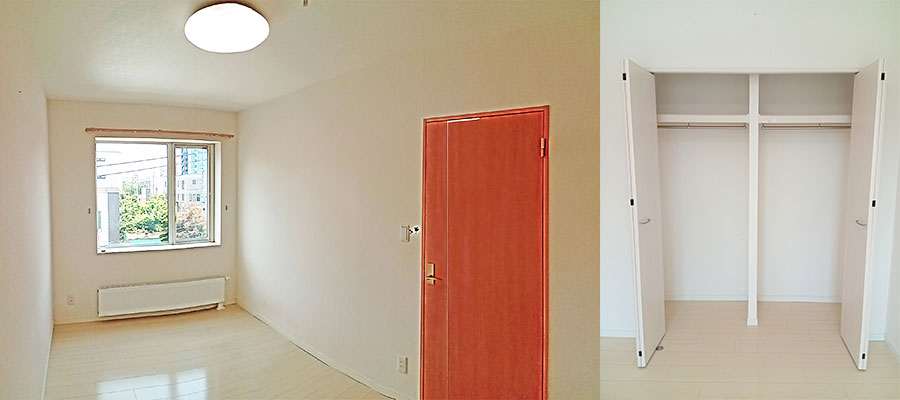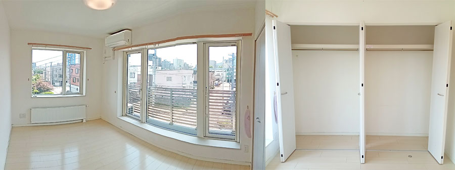 左:階段を上がって右手のお部屋。南側の開口部の窓が大きく、ふんだんに日差しが差し込みます。また東側にも窓があり解放感もたっぷりです。/右:お部屋を入って右手が一面収納です。