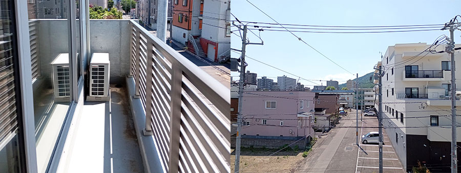 左:南側に位置し日差しが差し込むバルコニー/右:3階からの眺望。バルコニーから見て正面は道路で解放感があります。