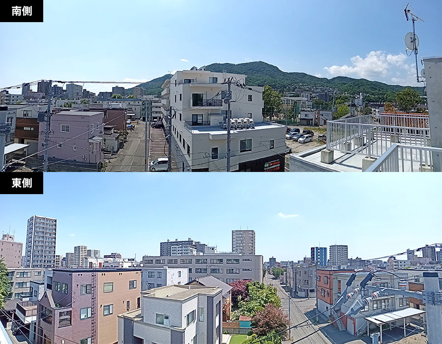 こちらの眺望をご覧下さい。藻岩山の四季折々の表情を楽しむことができます。また屋上ならではの解放感、疲れた心を癒してくれます。