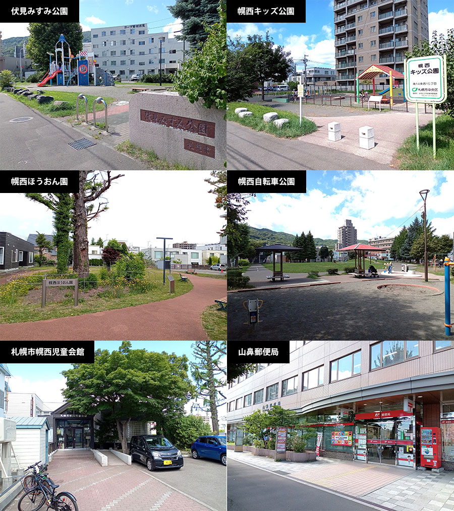 公園(伏見みすみ公園 約220m、幌西キッズ公園 約220m、幌西ほうおん園 約270m、幌西自転車公園 約300m)
