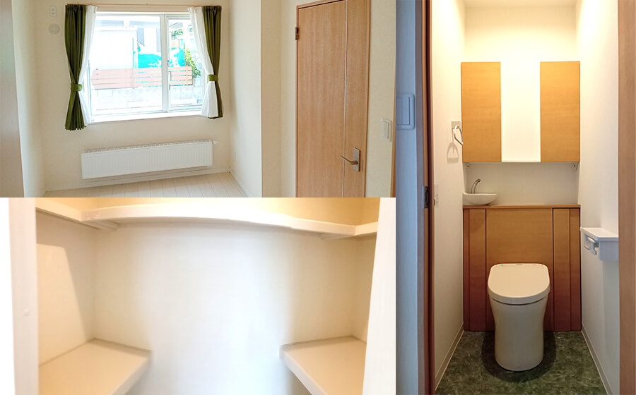 左上:1階洋室7.1帖。1階に位置しますが、窓が2枚完備されていて採光が確保されています。/左下:奥行きがある収納を完備。/右:1階にもタンクレスのトイレを完備、手洗い場もあります。