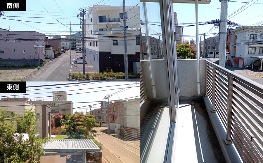 左上:南側の眺望。正面が道路となっているため、遮蔽物がなく解放感があります。/左下:東側の眺望。お隣さんが道路から距離を取って建築しているため、東側も解放感があります。/右:南向きで陽当り良好な2階のバルコニー。